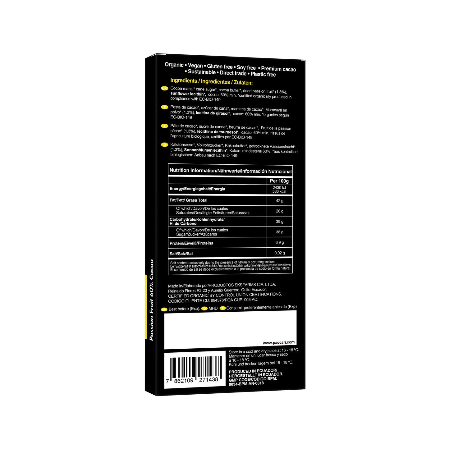 Award-winning, organic and vegan dark chocolate with 60% cocoa. A tropical blend of chocolate and tangy passion fruit.