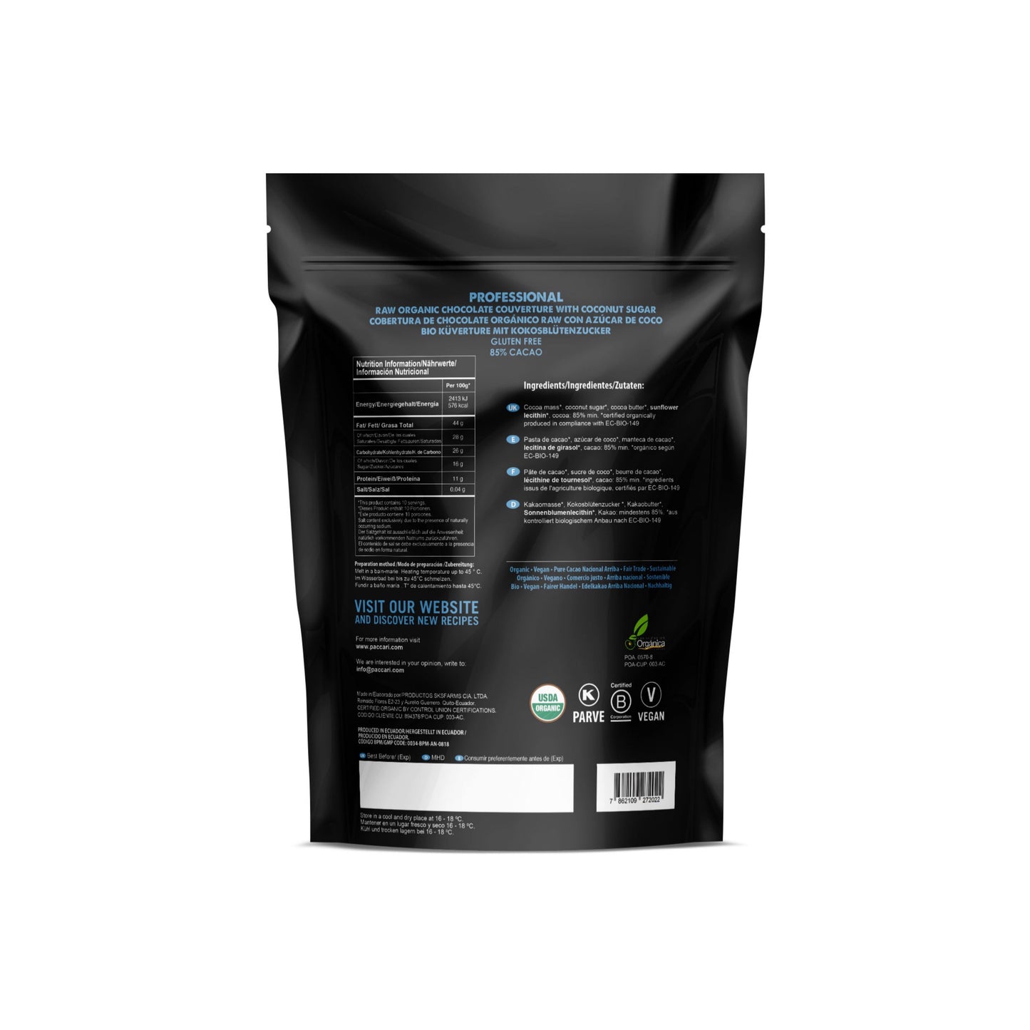 Our Paccari Professional Line lets you create pralines, truffles, cakes, and more with premium organic dark chocolate. These raw 85% couverture drops or pieces retain antioxidants and deep cocoa flavours, sweetened only with coconut sugar.