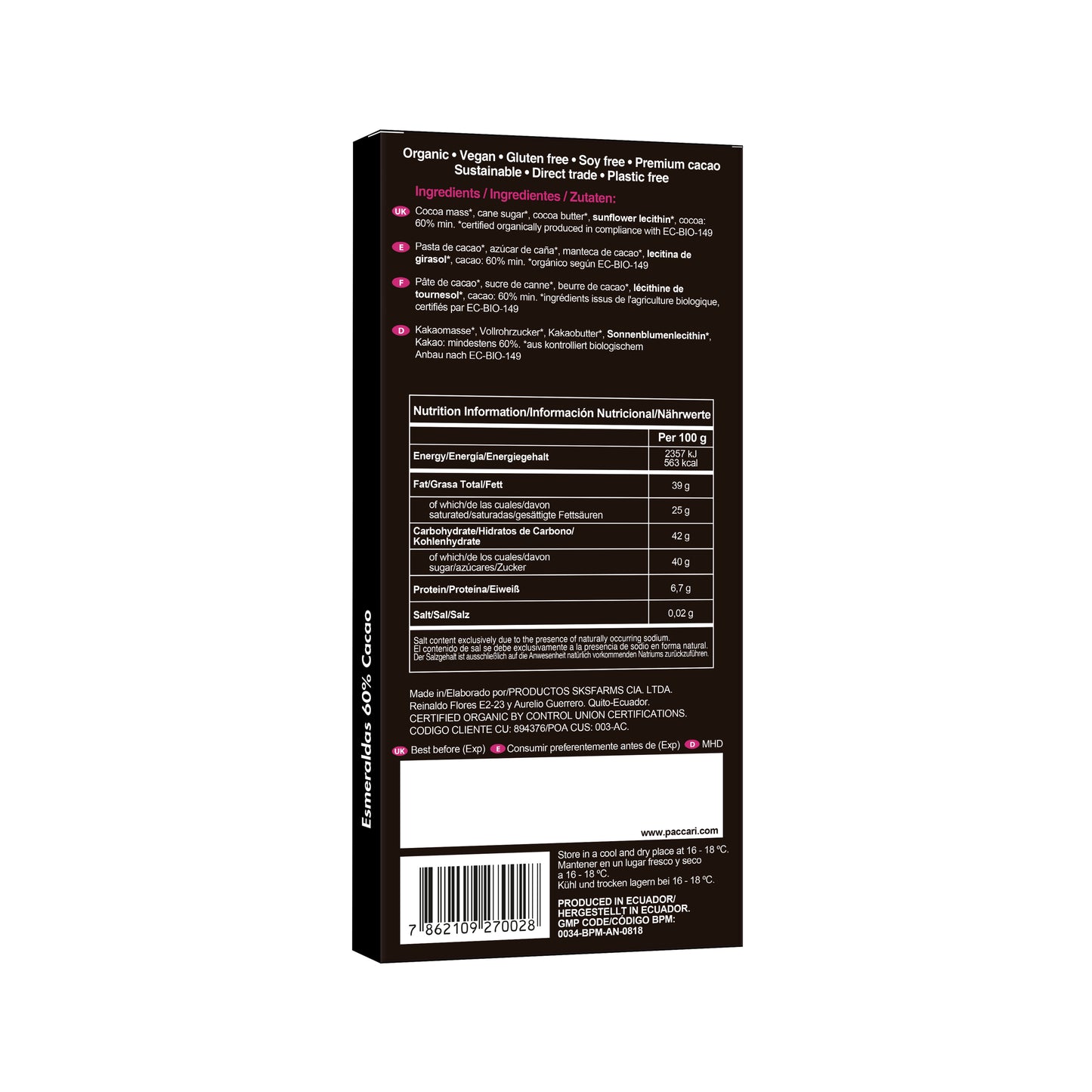 Award-Winning, organic and vegan (60% cocoa). Sourced from the Esmeraldas region in Ecuador, this chocolate is fruity and floral, offering a vibrant taste without any added fruits or herbs.