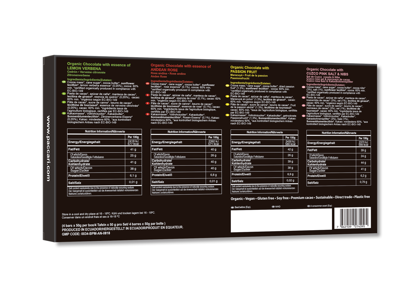 Our dark chocolate bars feature Latin American ingredients like Cuzco pink salt and Andean roses, winning over 400 international awards.