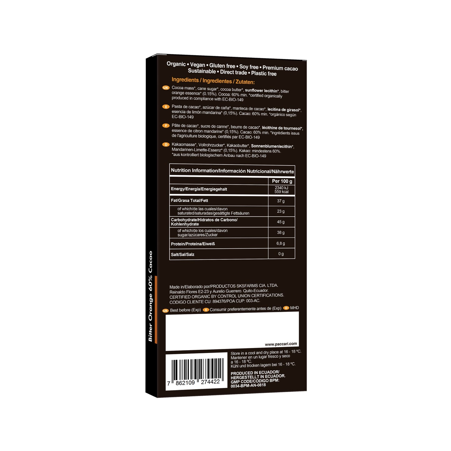 Award-winning, organic and vegan dark chocolate with 60% cocoa. A unique blend of Ecuadorian cocoa and tangerine for a perfect balance of sweetness and citrus.