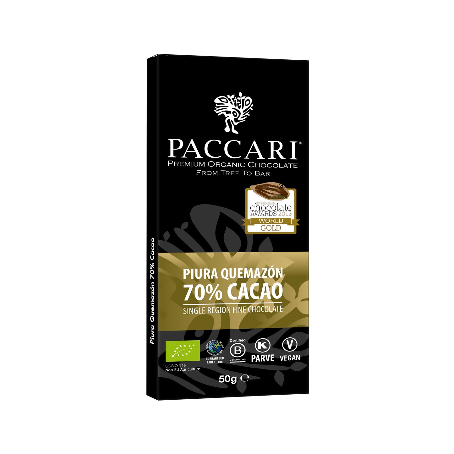 Award-winning organic and vegan chocolate with 70% Piura fine cocoa.